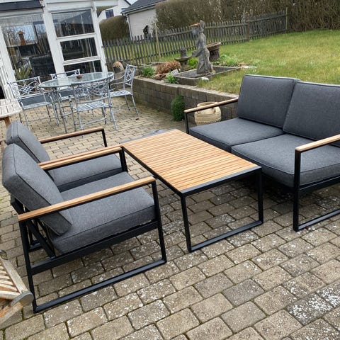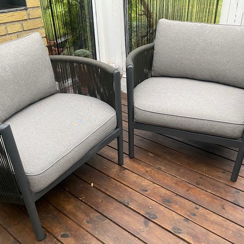 Havesæt bestående af en 2-3 personers sofa og en lænestol i matchende design. Møblerne har grå stel med snoredetaljer i siderne og løse grå hynder i sæde og ryg. Sofaen har to sædehynder og to ryghynder, lænestolen har én sædehynde og én ryghynde. Sættet er egnet til udendørs brug på terrasse, altan eller haveområde.