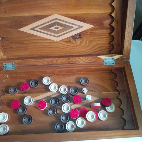 Foldbart kombineret skak- og backgammonspil med dekorativt bræt i rød og guld. Ydersiden fungerer som skakbræt med mønstrede felter og figurmotiver langs kanten. Indersiden er udformet som backgammonbræt med ornamenterede detaljer. Medfølgende brikker i flere farver til brug for begge spil. Egnet til brug i hjemmet eller til at tage med på farten på grund af den sammenklappelige kuffertlignende udformning.