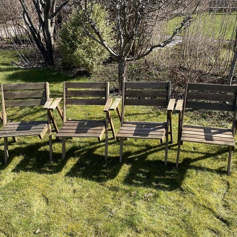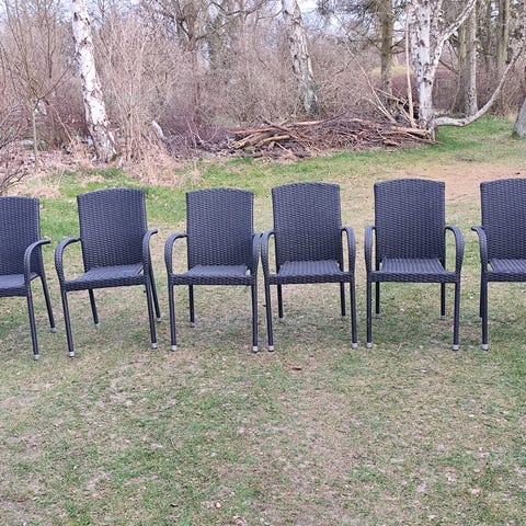 4 + 2 havestole i metal og træ. Modellen er Margurit og man sidde super dejligt i dem. Fremtræder med synlige brugsspor og trænger til rens og maling.