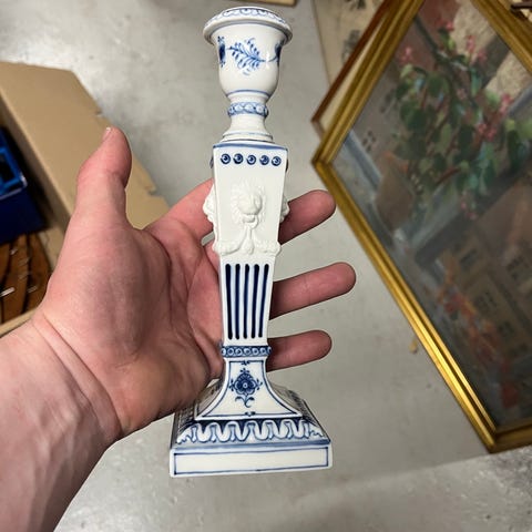 Nok en lysestage, men er uden genstands nummer. Er 9 cm i diameter og 5,6 cm høj. Har de blå 3 bølger som ser håndmalet ud. Er i perfekt stand. Kan have en anden funktion. Giver intet resultat på google lens. Kr 195