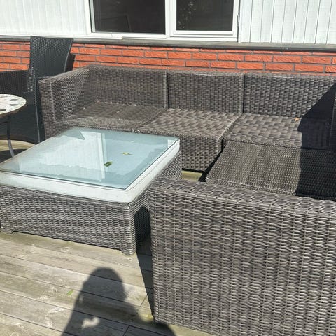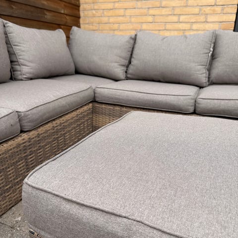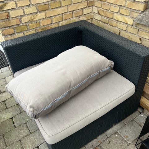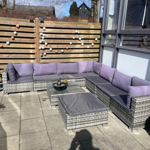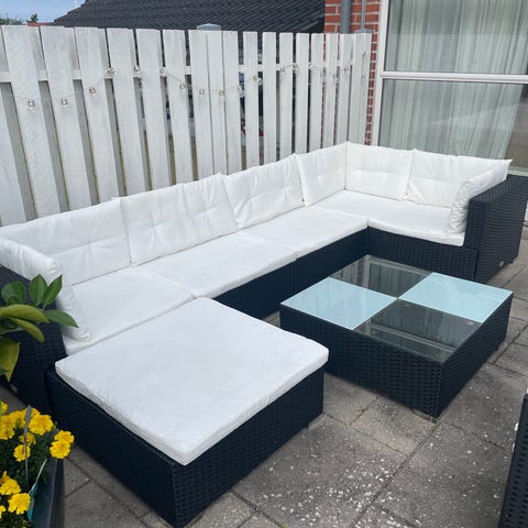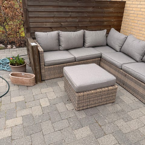 Hjørnesofa loungesæt til udendørs brug i sort polyrattan med mørke hynder. Sættet består af flere moduler, der kan samles til en stor hjørnesofa. Polyrattan-materialet er velegnet til terrasse eller have, og hynderne giver en blød siddekomfort. Egnet som loungemiljø på altan, terrasse eller i haven.
