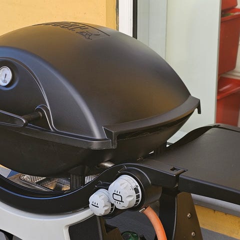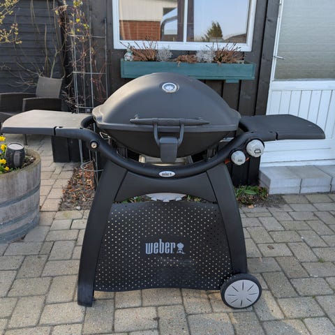 Weber Q gasgrill i sort. Grillen står på vogn med to sideborde og hjul, så den er let at flytte rundt på terrassen eller i haven. Tilsluttes gasflaske via gasslange. Velegnet til udendørs madlavning, fx grillning af kød, grøntsager og andre retter. Konstruktion i metal og plast med låg, der gør det muligt både at direkte- og indirekte grille afhængigt af behov.