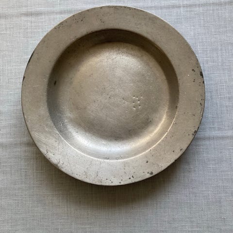 Fin gammel tin tallerken fra det 18.århundrede. Lavet af den fremtrædende danske hof-tinstøber i København, Magnus Johansen Schønfeldt. Han blev optaget i Københavns tinstøberlaug i 1764, død 1791.