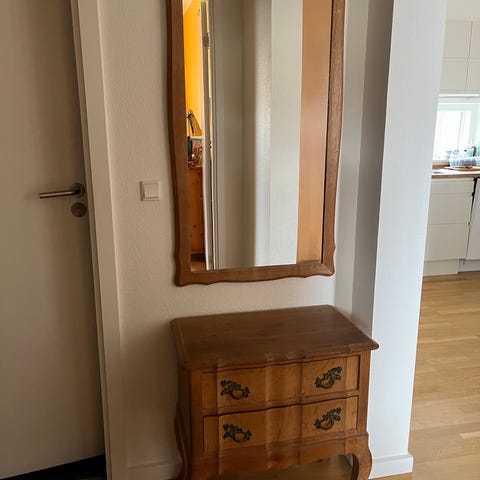 Smuk servante købt i antikvitetsbutik i Bredgade i 1976. Velholdt og med sit originale udtryk bevaret – flot patina og masser af sjæl. Et klassisk møbel med karakter, der giver varme og stil til hjemmet. Møblet har en stor, oval spejlramme samt to små skuffemoduler øverst med flere små skuffer. Nederst er der brede skuffer med greb i metal. Egnet som opbevaringsmøbel i soveværelse eller entre, hvor der er behov for både spejl og opbevaring.