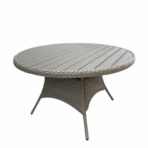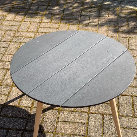 Rundt havebord i træ i olieret træ. Bordet har en bordplade med lameller og en kegleformet understel med lodrette trælameller og rund fod. Velegnet som sidebord eller mindre bord på terrasse, altan eller i haven.