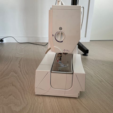 Bernina Activa 130 symaskine i hvid. Elektronisk maskine med display og betjeningsknapper på fronten. Maskinen har friarm og aftagelig tilbehørsboks. Medfølgende hård plastkasse med bærehåndtag til opbevaring og transport. Egnet til almindelige syopgaver i hjemmet, reparationer og kreative projekter i forskellige stoftyper.