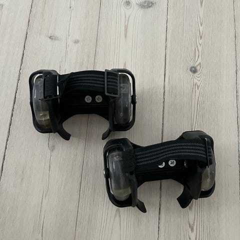 Nye og ubrugte lyserøde hælrulleskøjter med elastikstrop, hjulene blinker lidt, når de ruller rundt.