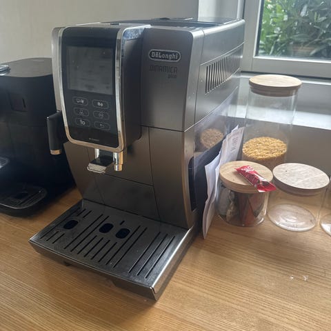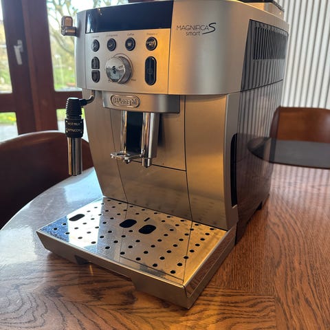 De'Longhi espressomaskine med integreret kaffekværn i sort. Maskinen har manometer på fronten til visning af bryggetryk samt flere dreje- og trykknapper til indstilling af brygning. Der medfølger portafilter med filterkurve samt tilbehør i rustfrit stål som mælkekande og beholder.