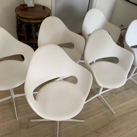 Stolene fremstår i flot stand med almindelige, lette brugsspor på stel, som er helt naturlige for alderen. Sæderne fremstår meget pæne og giver stolene et opdateret, men stadig tidstypisk udtryk.