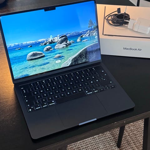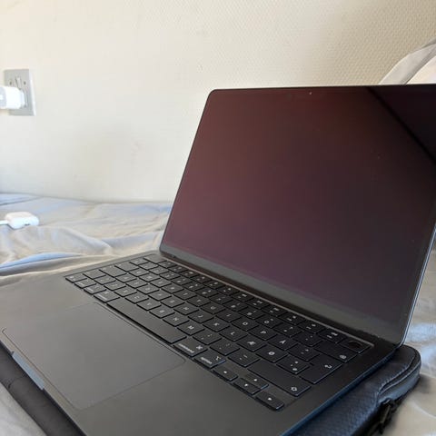 Apple MacBook Air bærbar computer med 13,6 tommer skærm. Modellen er udstyret med Apple M4-chip og 256 Gb. Enheden fremstår i mørk farve (midnat). På billederne ses, at skærmen har synlige striber og grafiske fejl. Der medfølger oplader og original æske, som vist på billederne. Den blev købt august 2025 så den er ikke ældre 9 måneder. Alt virker som det skal, skærm skal bare fikses.
