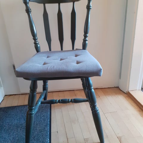 Spisestuestol i lyst lakeret bøgetræ med kryds i ryglænet. Sædet er polstret og betrukket med blåt stof med lille mønster i rødt. Egnet til brug ved spisebord eller som ekstra siddeplads i køkken eller stue. I alt 8 stk. Sælges samlet for 400 kr.