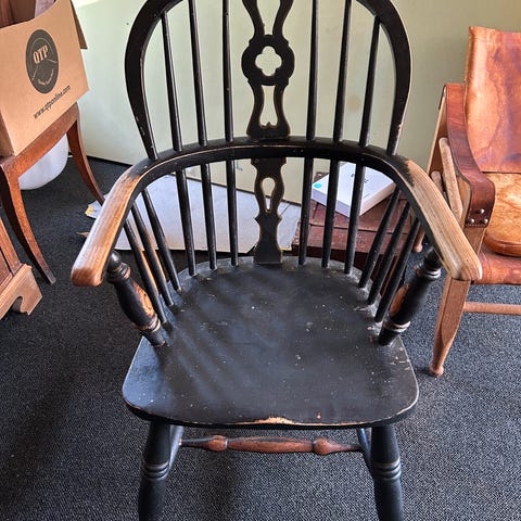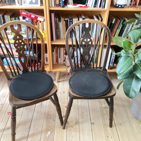 Flot Windsor stol, som vurderes at være i egetræ og fra 1800-tallet. Stolebenene er drejede, smuk rygudskæring, behagelige armlæn. Står godt og stabilt. Smuk stol til spisebord, skrivebord eller hygge.