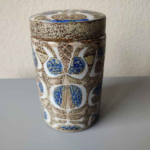 Smuk lågkrukke fra Baca serien Aluminia af Niels Thorson.