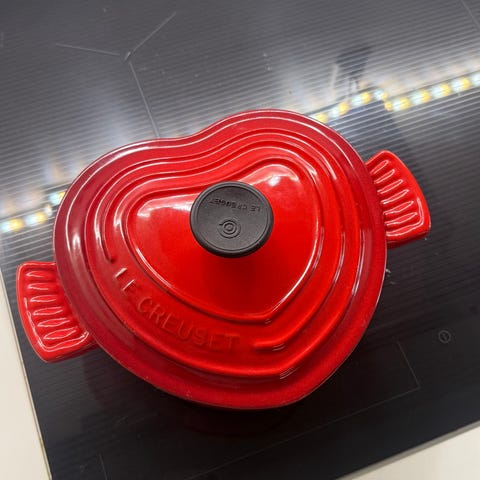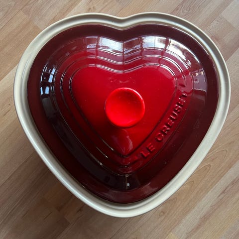 Le Creuset hjerteformet gryde i rød emaljeret støbejern. Gryden har to håndtag og medfølgende låg med hjerteformet knop. Indvendigt er gryden lys emaljeret. Velegnet til madlavning på komfur og i ovn, afhængigt af komfurtype og producentens anvisninger.