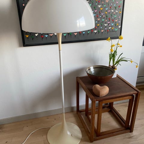 Meget smuk og retro Verner panton Panthella lampe. Malingen er skallet en smule af og bunden har lidt knubs og skærmen er gået i stykker (alle tingene kan ses på billederne) men kan sikkert repareres. Hurtig afhentning prioriteres