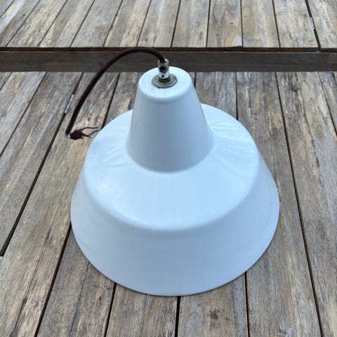 Louis Poulsen pendel lampe i hvidt metal, designet af Poul Henningsen. Klassisk kegleformet skærm med perforeret top og ledning til loftsmontering. Egnet til almindelig E27 lyskilde (max 100 W ifølge mærkat). Velegnet som belysning over bord eller i rum, hvor der ønskes nedadrettet lys. Flere ens lamper kan bruges samlet for ensartet belysning.