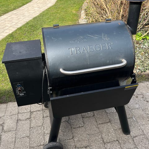 Traeger Pro 22 til udendørs madlavning. Grillen har integreret pillemagasin og skorsten til røgaftræk. Den er udstyret med elektronisk styring på siden til regulering af temperatur. Konstruktionen er i metal med låg og håndtag på fronten samt ben med hjul på den ene side for lettere flytning. Indvendigt ses brændkammer og varmeplader i stål, som er præget af brug. Velegnet til grillning og røgning af kød, fisk og grøntsager ved hjælp af træpiller som brændsel.