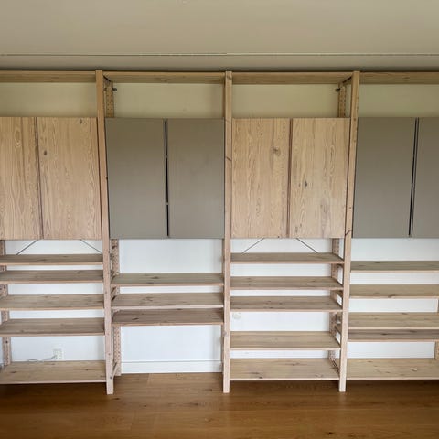 IKEA reol med skuffer og låger. Reolen består af kvadratiske rum, hvor nogle er åbne og andre er udstyret med skabslåger og skuffer i en grønlig/blålig frontfarve. Der er 8 skuffer og 6 låger