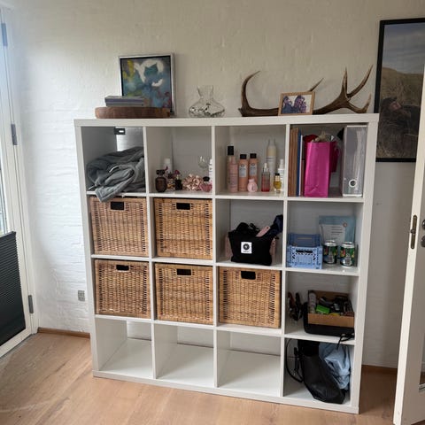 Korpus fremstår i en mørk træ- eller trælook-farve. Egnet til opbevaring af bøger, dekoration og diverse småting i stue, kontor eller værelse. Reolen kan placeres op ad en væg eller fungere som rumdeler afhængigt af indretning.