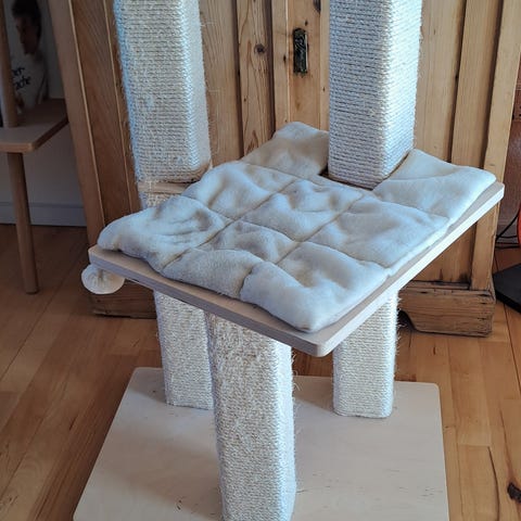 Kradsetræ med tykke sisalstammer og flere liggepladser. Modellen har to runde hyggesenge og en hængekøje i grå polstring. Bundpladen er i lyst træ, og stolperne er omviklet med sisal, som giver katten mulighed for at kradse. Puderne er bløde og aftagelig og de kan vaskes. Velegnet til én eller flere katte, der har brug for både hvilepladser og kradseplads i hjemmet.