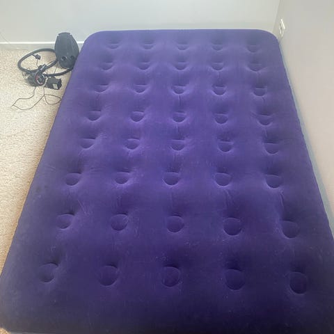 Oppustelig madras til bil bagagerum i grå farve. Madrassen er udformet til at ligge hen over bagsæder og bagagerum og giver en plan liggeflade. Overfladen har langsgående luftkamre for jævn støtte, og der medfølger integrerede nakkepuder. Velegnet til brug i personbil ved overnatning, hvilepauser eller som ekstra liggeunderlag på ture. Materiale er oppusteligt plast med blød overfladefinish.