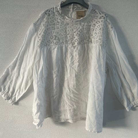ICHI bluse til kvinder i str. M. Blusen er hvid og fremstillet i bomuld. Modellen har lange ærmer og rund hals med knaplukning i nakken. Overdelen har blonde-/hulmønster øverst foran og ved halsen, som giver et let og luftigt udtryk. Velegnet til hverdagsbrug eller mere pæne anledninger afhængigt af styling.
