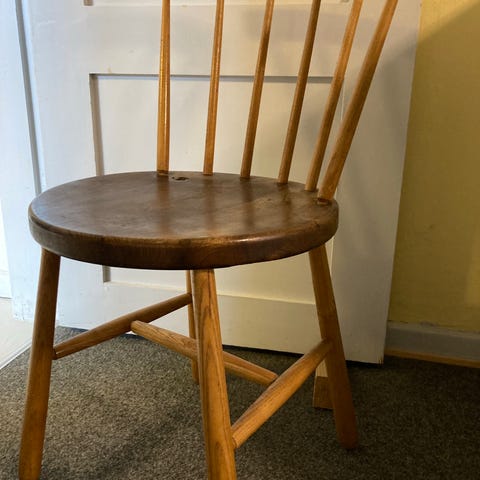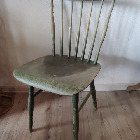 Meget fine retro tremmestole. En pind er flækket og de skal nok lige have en klat maling. Formentlig fra fdb men mærket er desværre udvisket.