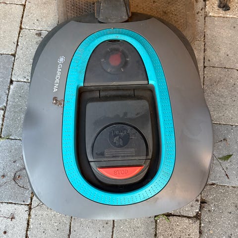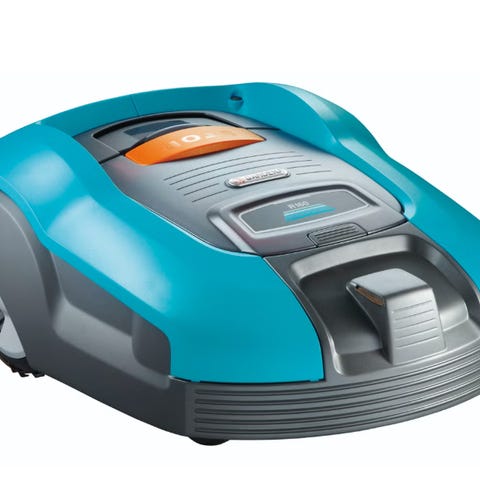 Gardena R40Li robotplæneklipper i grå og blå plast. Modellen er beregnet til automatisk klipning af græsplæner og kører selvstændigt inden for et afgrænset område med kanttråd. Enheden har betjeningspanel med display og numerisk tastatur til indstilling af klippetider og funktioner. Robotplæneklipperen er egnet til privat brug i haven til regelmæssig vedligeholdelse af græsplænen.