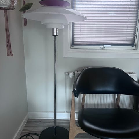 Louis Poulsen PH gulvlampe designet af Poul Henningsen. Klassisk flerskærmslampe med hvid skærm og rød topskærm, monteret på slank metalstand med rund fod. Lampen giver et blændfrit og diffust lys, velegnet som belysning i stue, læsehjørne eller andre opholdsrum. Egnet til standard lyskilder med almindelig fatning (se specifik model og fatning på lampen).