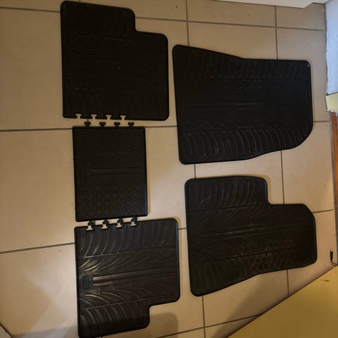 Sæt med gummimåtter og bagagerumsbakke til bil i sort. Sættet omfatter flere gulvmåtter med rillet overflade samt en formstøbt bagagerumsbakke med forhøjede kanter, der hjælper med at holde snavs og væske inde på måtten. Fremstillet i slidstærkt gummimateriale, velegnet til beskyttelse af bilens kabine og bagagerum mod snavs, vand og mudder.