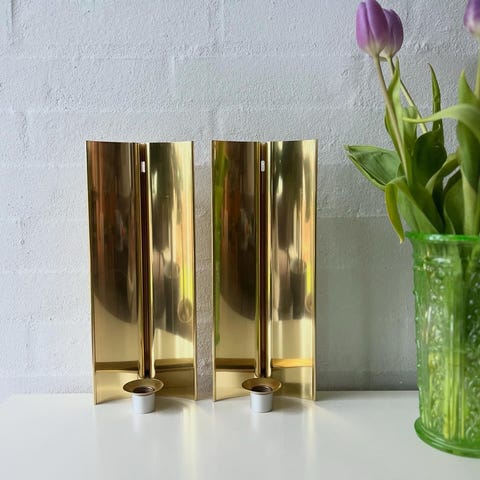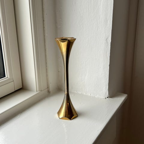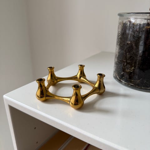Patineret forgyldt (24 karat) lysestage til 4 fyrfadslys / fyrfadsstage i messing - med skøn patina / fregner. L 21 cm, H 16/14/12/10 cm.