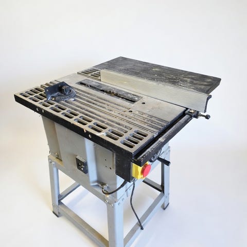 Virker fint - Bordrundsav på stativ med integreret rundsavklinge. Savens bordplade er rektangulær og monteret på et fast understel i metal. Fronten har betjeningsknapper samt håndtag til justering af klingens højde og vinkel. Egnet til længde- og geringssnit i træ og lignende materialer i værksted eller garage. Strømtilslutning via ledning under bordet.