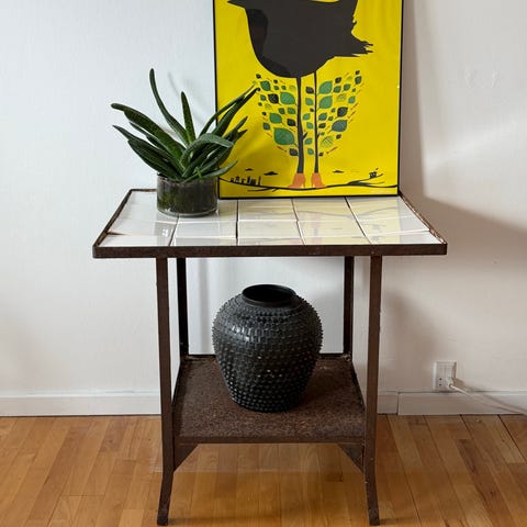 Gammelt tungt gasbord i jern med originale fliser. Halvdelen ligger løse, men kan sættes fast.