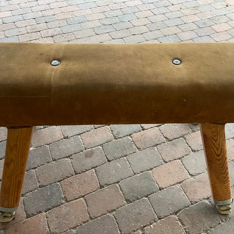Bænk/Springbuk/Gymnastikbuk,betrukket med ruskind,ben af fyrretræ.