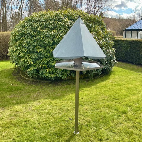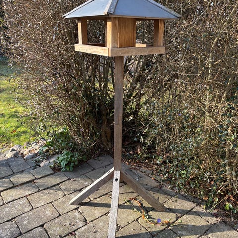 Fuglefoderhus og foderbræt på fod. Højde 150 cm. Hus diameter 54 cm.