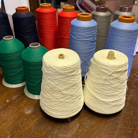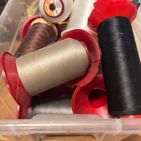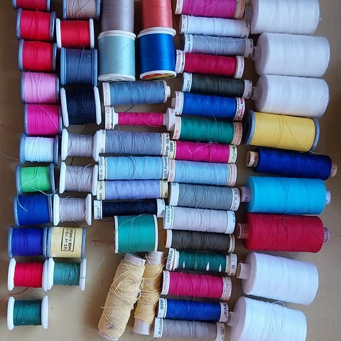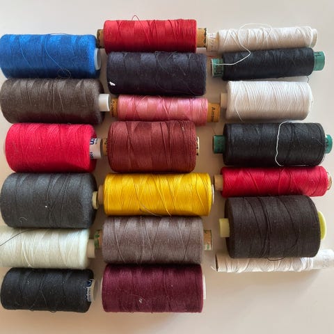 Sytråd i flere forskellige farver. Rullerne fremstår som større spoler egnet til syning og reparation af tøj, tekstiler eller andre hobbyprojekter. Farverne spænder blandt andet over hvid, grå, brun, grøn og orange. Materiale og mærke er ikke oplyst. Velegnet til brug i symaskine eller til håndsyning afhængigt af trådens tykkelse og maskinens kompatibilitet.