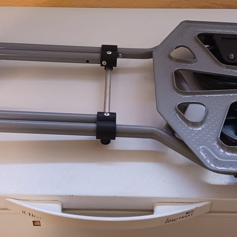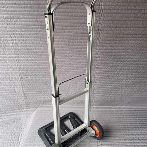 2 stk Sammenklappelig sækkevogn i aluminium med teleskophåndtag. Vognen har to hjul og en klapbar læsseplade i metal. Egnet til transport af kasser, flyttekasser og andre emner, hvor der er behov for en kompakt og let opbevaringsløsning, når vognen ikke er i brug.