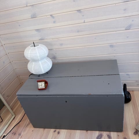 Trækiste med hængslet låg og kraftige metalbeslag. Kisten er udført i massivt træ med synlige åretegninger og påførte tryk/tekst på ydersiden. Udvendigt er der sorte metalbånd og nitter, som stabiliserer konstruktionen. Indvendigt er kisten enkel og rummelig uden inddeling, egnet til opbevaring af fx tæpper, legetøj eller andre genstande. Overfladen fremstår med et rustikt, brugt udtryk.