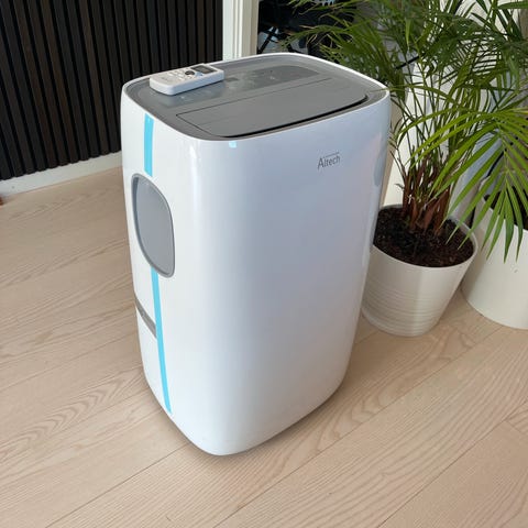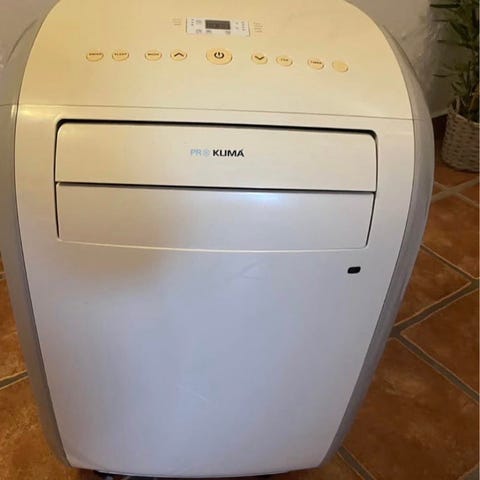 Mobil A/C i hvid fremstår som nyt. Enheden er fritstående og tilsluttes almindelig stikkontakt. På toppen findes betjeningspanel med display og knapper til indstilling af funktioner. Bagsiden har udtag til aftræksslange samt bærehåndtag. Medfølgende dele omfatter aftræksslange, fjernbetjening og monterings-/tætningssæt til vindue samt brugervejledning. Velegnet til køling af indendørs rum, hvor der er mulighed for udluftning gennem vindue eller dør via slangen.