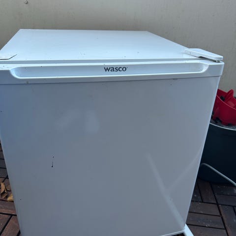 Afhentes i Ganløse - Ældre, lille Wasco køleskab. H 85, b 55, d 55. Fungerer perfekt. Fint til feks camping.
