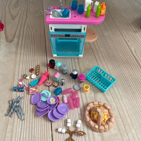 Barbie opvaskemaskine/køkken. Sættet består af en opvaskemaskine samt diverse tilbehør. Intet tegn på slid - fremstår rigtigt flot!