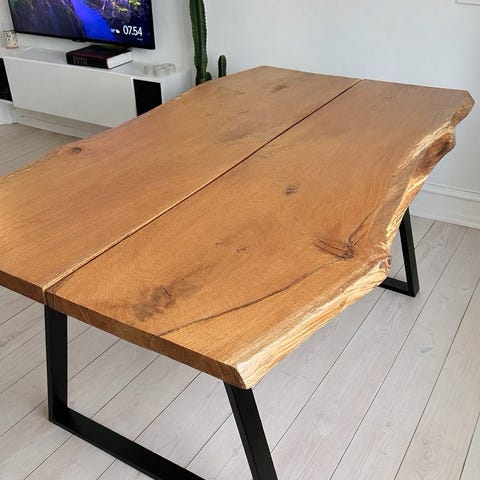 Plankebord i massivt egetræ, håndlavet i København af snedker Anders fra Made By Anders. Bordet er fra 2016 og har været brugt af en familie i 10 år, men fremstår i rigtig god stand med naturlig patina. Nypris 10.000 kr. – et solidt og tidløst bord med masser af liv tilbage.