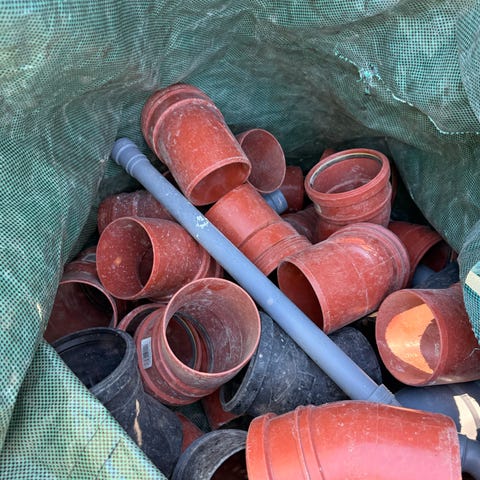 Blandede kloakrør og rørfittings i plast i grå og orange farver. Partiet omfatter lige rør, bøjninger, T-stykker, samlemuffer og diverse overgangsstykker det meste er i 110.
