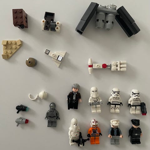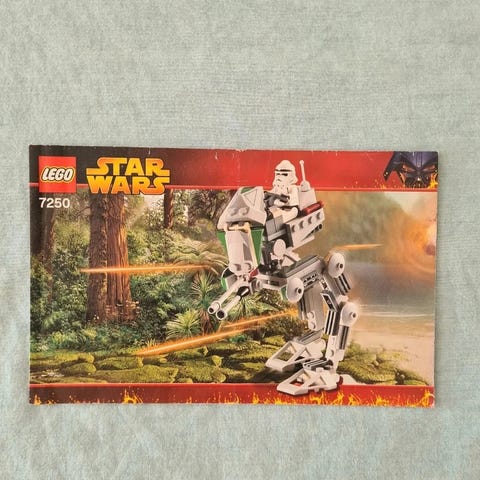 LEGO Star Wars byggesæt med AT-ST walker og tilhørende minifigur. Sættet består af løse klodser i grå nuancer, en Star Wars soldater-minifigur med hjelm og våben samt trykt samlevejledning.