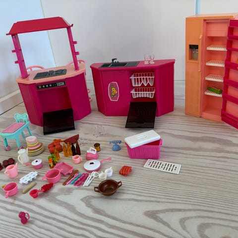 Barbie køkkensæt med dukke. Køkken og køleskab. Køleskabet kan åbnes. Tilbehør som mad, tallerkener, bestik osv. medfører. Fremstår rigtigt pænt.