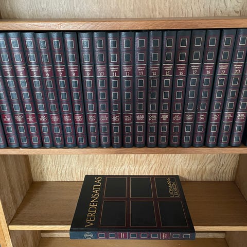 Lademanns Leksikon fra 1981 i 20 bind inkl. verdensatlas fra 1977 med guldsnit. Dekorativt at have stående og kan evt. dekorere på f.eks. en bogcafé.