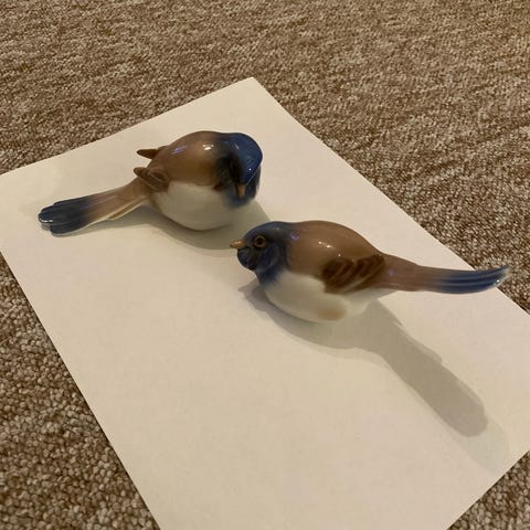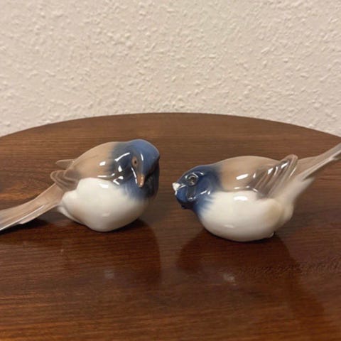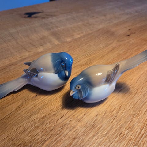 Porcelænsfigurer i form af to små fugle i blå, beige og hvid glasur. Figurerne er naturtro udformet med detaljeret fjerstruktur og glansfuld overflade. Velegnet som dekoration på hylde, reol eller bord, enkeltvis eller som sæt.