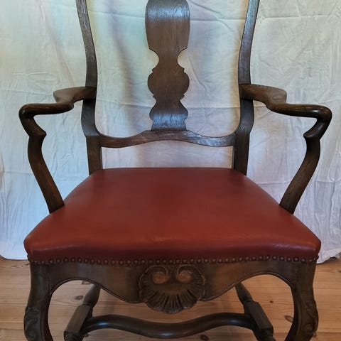 Smuk og karakterfuld krongestol med tydelige referencer til møbelhåndværk fra starten af 1900-tallet. Stolen fremstår med elegante, håndskårne detaljer i både armlæn og front, som giver et eksklusivt og tidløst udtryk.