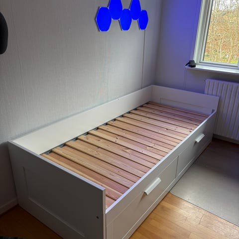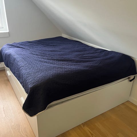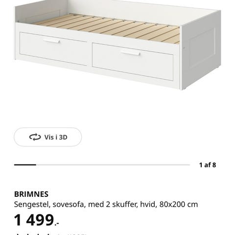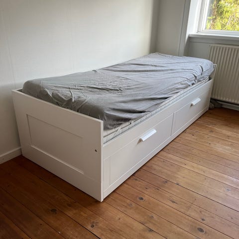 IKEA BRIMNES sengestel med skuffer i sort. Sengestellet kan trækkes ud så der er plads til en ekstra person og har to integrerede skuffer under sengen, som giver ekstra opbevaringsplads til fx sengetøj eller tøj. Farven er mørk/sort, og designet er enkelt og funktionelt, velegnet til soveværelse, gæsteværelse eller mindre rum, hvor der er behov for både seng og opbevaring i ét møbel.
