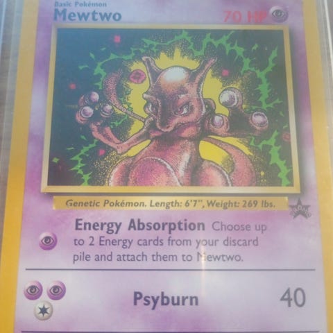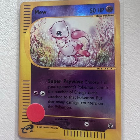 Pokémon Ancient Mew samlekort i holo-udgave. Kortet har motiv af Mew på forsiden med runeskrift og holografisk baggrund. Bagsiden har et særligt Pokémon-design med farvede symboler og cirkel i midten. Egnet til samling eller som del af et Pokémon-kortsetup.